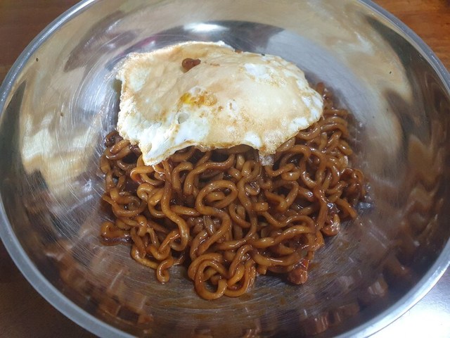 오늘 점심은 짜파게티에 계란후라이 얹어서 먹었습니다~