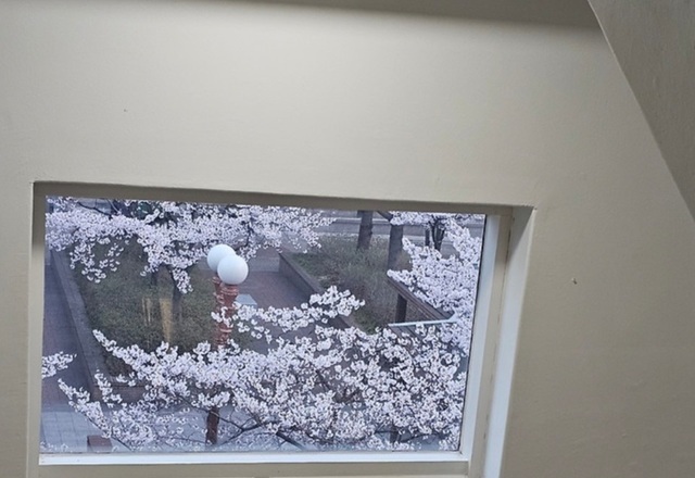 운동 끝나고서 커피숍에서 내려오는 계단에서 창밖 벚꽃