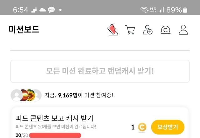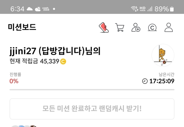 오늘의 미션보드 완료후 6캐시 받았어요 일요일아침 여유롭고 행복한 하루되세요 오늘도 활짝 ^_____________________^.