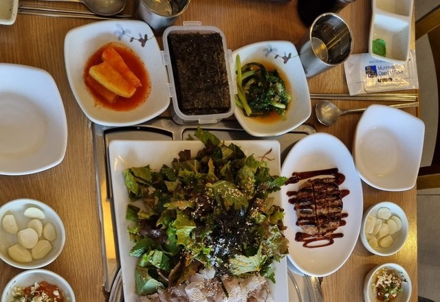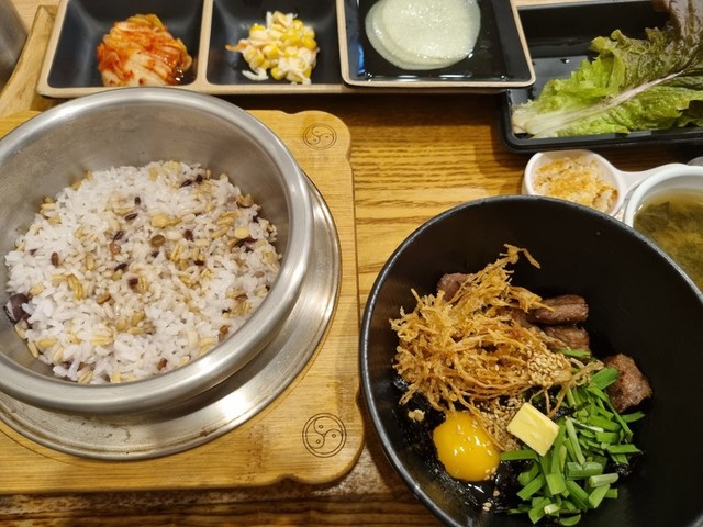 늦은점심으로솥밥먹었어요.친구는연어장.나는스테이크.맛있게쟐먹었습니다~~