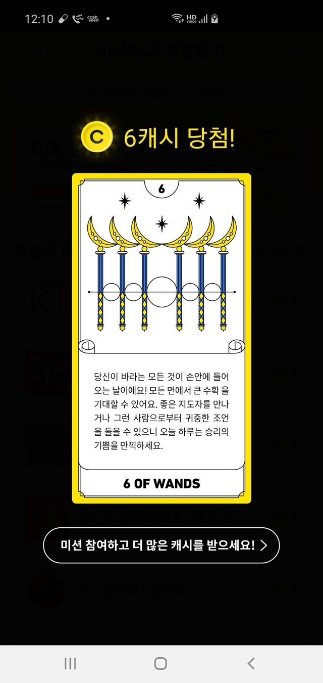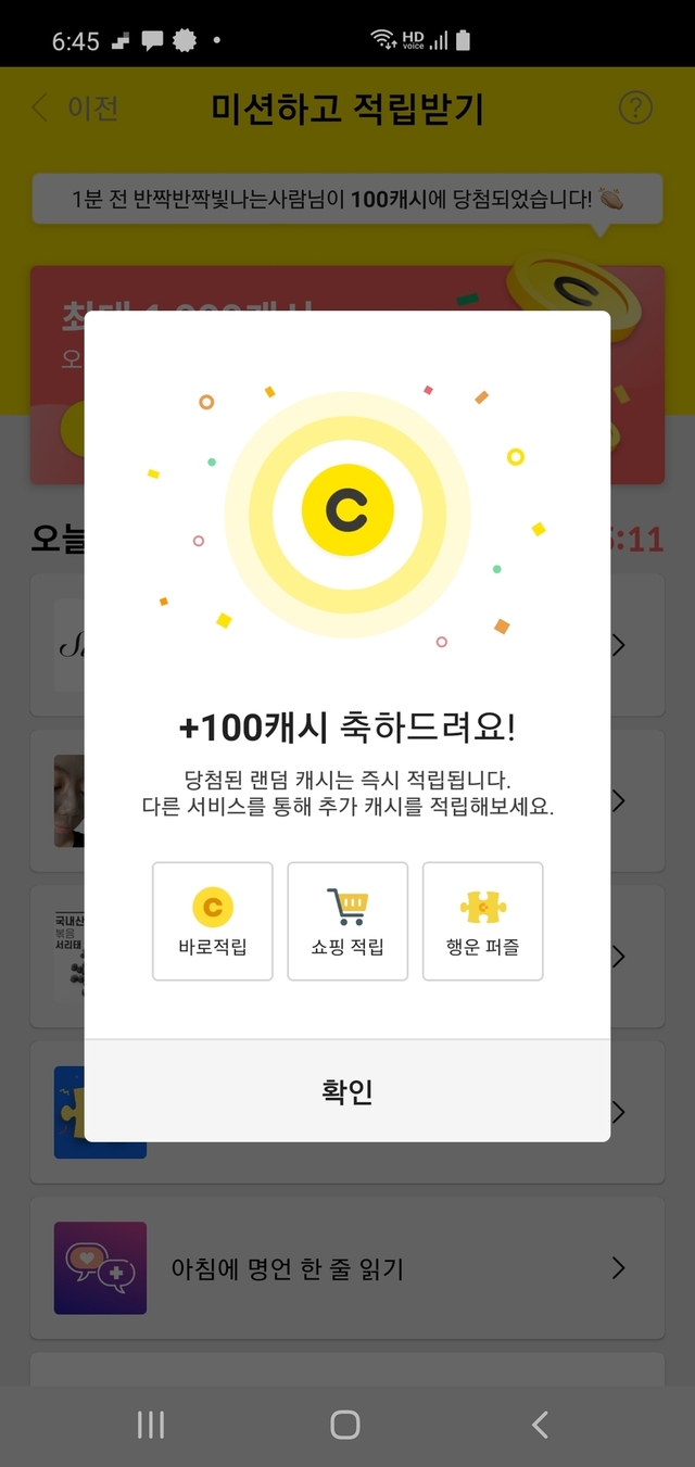 어제 오늘 미션성공 100캐시 당첨^^