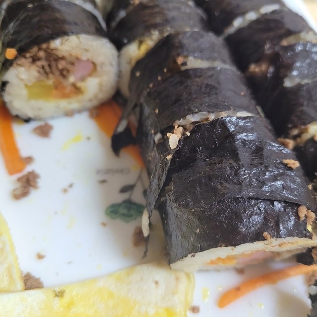 생선살과 새우살로 아가를 먹이기 위해 어묵을 만들었다. 그러나 간 조절실패로 우리가 먹었다. 너무 짜서 신랑이 탕으로 해 달라고하여 탕으로 했더니 성공ㅠ . 소고기 김밥과 함께 한끼를.^^