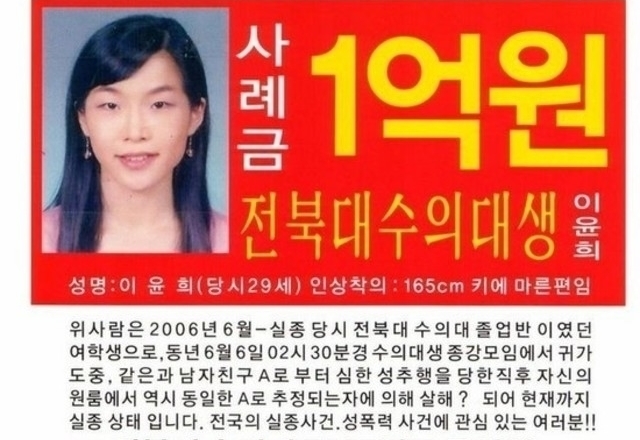 이윤희 실종 사건13년 전 전북대 수의대 4학년 학생이 과 종강파티 참석 후 새벽에 원룸에 돌아간 후 지금까지 발견되지 않고 있다.종강파티 후 그녀를 원룸 입구까지 데려다 준 사람은 그녀를 혼자 좋아하던 같은 과 남자 동기였다.실종 당일 그녀의 컴퓨터에는 '112'와 '