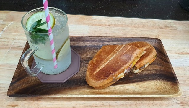 동네 새롭게 오픈한 샌드위치 가게입니다오픈 기념으로 쿠바샌드위치 주문하면모히또 한잔 무료로 준다고 해서 냉큼 들어간 곳쿠바샌드위치는 미국의 쿠바 노동자들이 먹던 샌드위치로빵에 버터를 바르고 햄과 훈연한 돼지고기, 치즈, 피클을 넣은 다음 그릴로 꾸욱 눌러 굽는다고 하네요즉, 맛있는 거 다 넣어 먹는 따뜻한 샌드위치 ㅎ모히또는 처음 먹어 보는데 상큼한 청량감이 끝내주네요간만에 식당에서 맛난 식사했습니다 오늘도 행복한 하루되세요 🤗