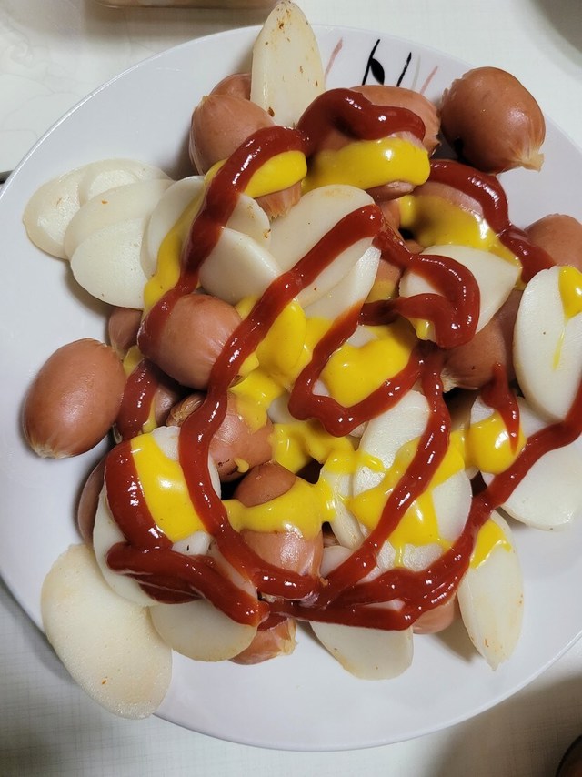 3 비엔나소시지,떡볶이 떡이랑 데친후 기름에볶구 케찹과머스터드소스를 뿌렸어요^^