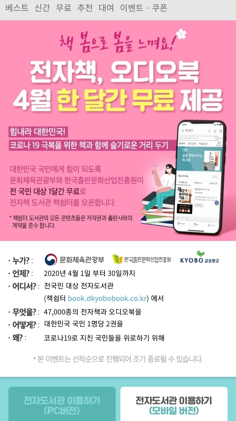 20.04.07 195 읽음 교보문고 전자도서관 1개월 무료~ 크롱친구 구독하기 0 12 콘텐츠의 수익 24 교보문고에서 사회적 거리두기를 응원하기 위해,1개월동안 전자도서관 전자책을 무료로 대여해주네요~PC, 모바일 둘다 이용가능하고1인 2권 대여 가능합니다~ 12 0 / 300 입력