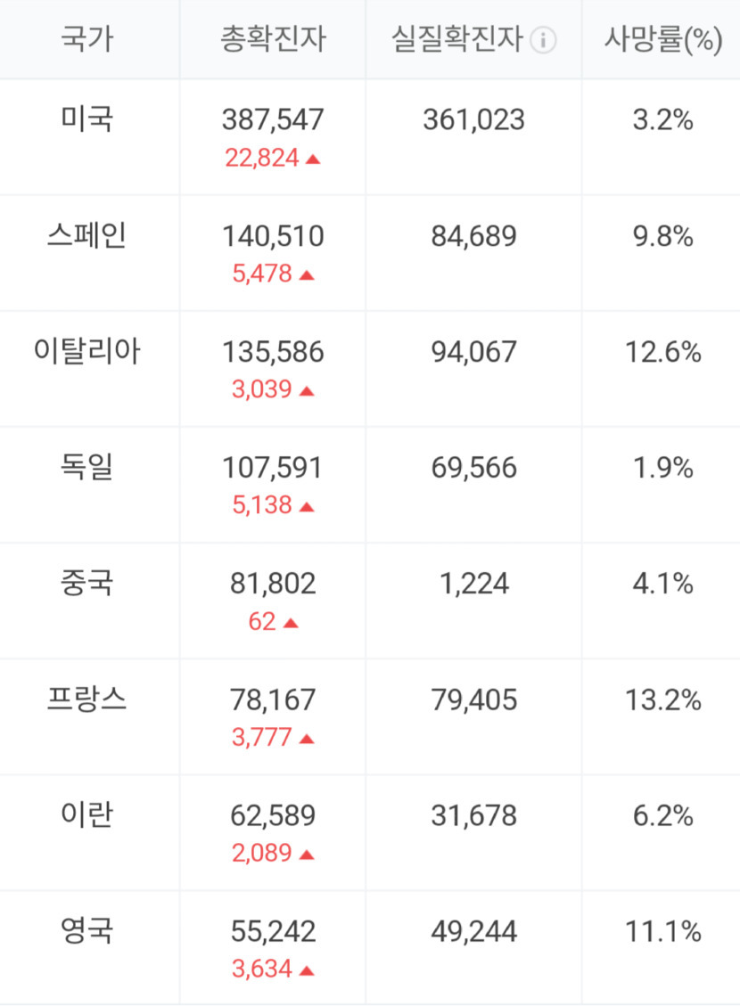 20.04.08 263 읽음 코로나 바이러스(우한 폐렴) 세계 현황 Dorapaeng 도라팽 구독하기 2 13 콘텐츠의 수익 39 4월 8일 9시 기준 세계 확진자-사망자-발생국 현황입니다.4월 8일 9시 기준 세계 확진자 top 20 국가 총확진자-실질확진자-사망률 현황입니다. 13 0 / 300 입력