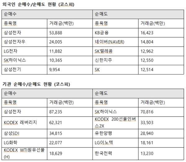 이날 외국인투자자의 코스피시장 기업 최대매수는 삼성전자로 향했다. 외인은 삼성전자 538억 원, 삼성전자우 240억 원, LG전자 118억 원, SK하이닉스 103억 원, 삼성전기 99억 원 순으로 사들였다.