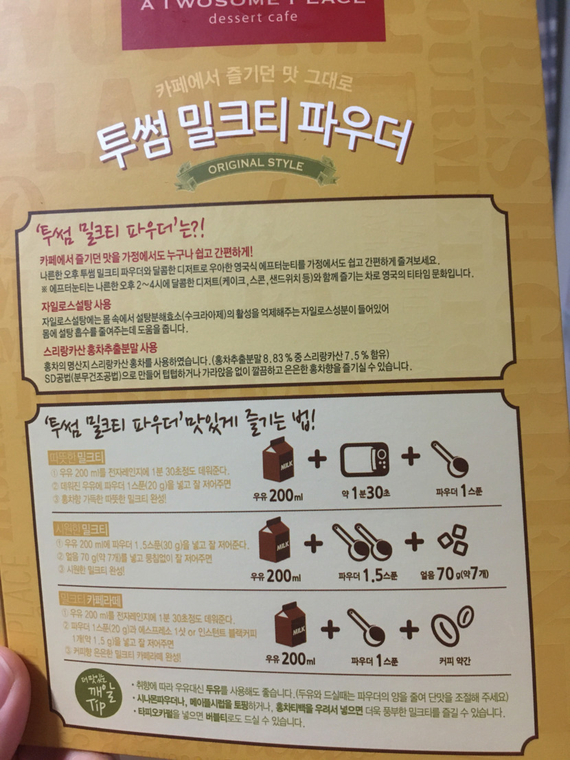 20.05.27 359 읽음 내돈내산)투썸 밀크티 파우더를 사보았다! josephelorraine 구독하기 5 59 콘텐츠의 수익 40 이마트에 투썸 밀크티 파우더를 팔길래 사봤어요~뒷면 설명서를 보고 카페모카와 밀트티 하기로 결심!왼쪽은 카페라떼 오른쪽은 밀크티~밀크티는 기전 레시피보다 1/4스푼더 넣더니 맛이 진해서 좋고~카페라떼는 레시피에 설탕 조금 넣으니 당 떨어질때 최고네요~비스킷이나 누가크레커 찍어 먹으니 더 맛있어요~코로나땜에 외출 거의 안하는데투썸 밀크티 파우더로 홈 카페분위기 내니 좋아요~ 59 0 / 300 입력