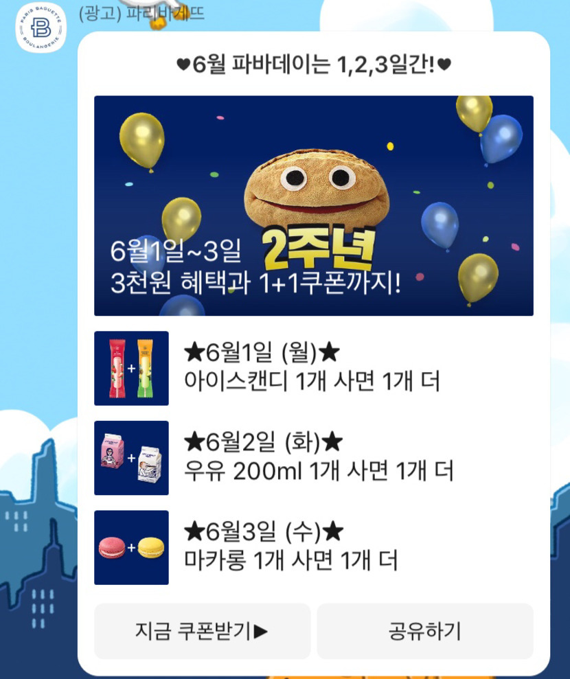 파리바게트 파바데이1+1행사 카톡쿠폰받아 사용하세요