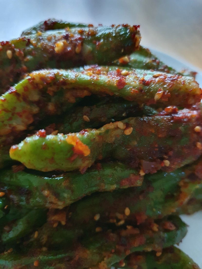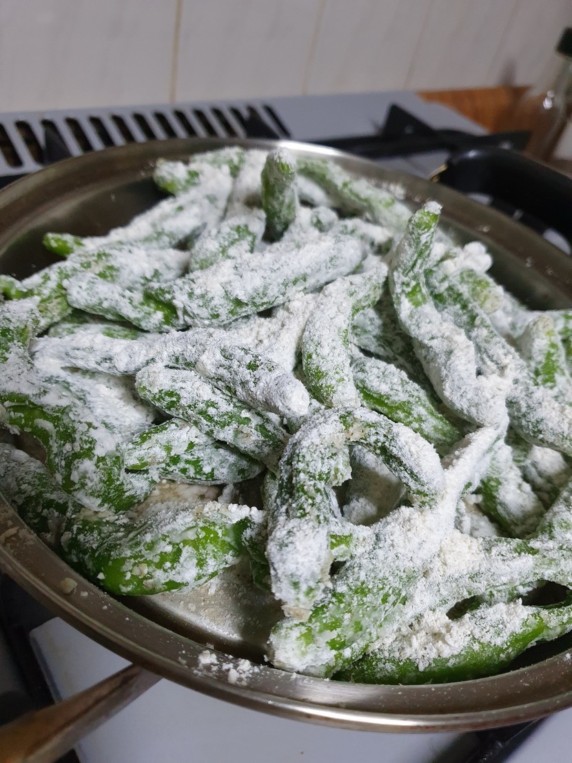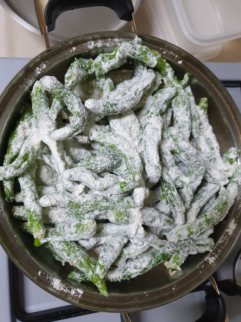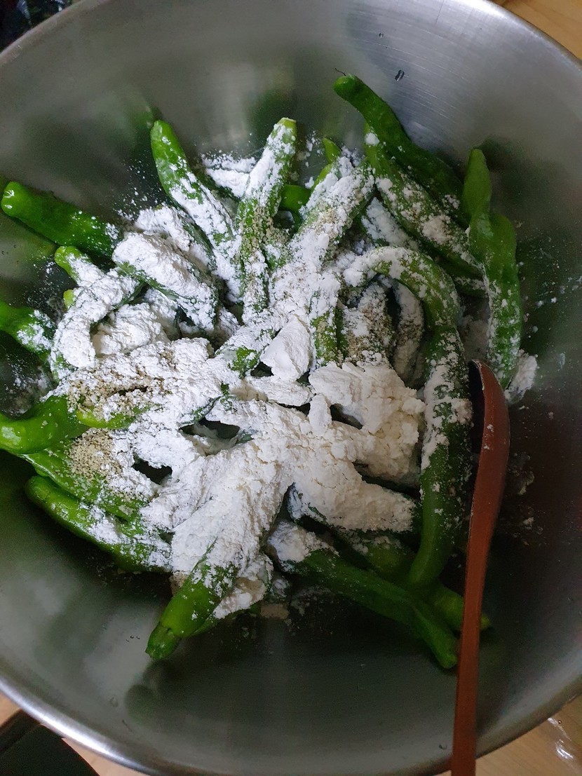 20.06.03 315 읽음 꽈리고추 찜🥕🌽🌶🍄🧄 mndjaak 구독하기 11 37 콘텐츠의 수익 21 농수산시장에 과일서러 갔다가 꽈리고추가 1키로에 4000원에 세일해서 사왔어요집에 도착해서 바로 요리를 시작했어요꽈리고추를 손질해서 깨끗이 씻은후 들깨가루 부침가루를 골고루 묻혀서 찜기에 날가루가 없이 잘익혀주세요익힌 꽈리고추를 뜨거운 김을 날린후고추가루 간장 마늘 참기름 깨를 넣고 숟가락 두개로 살살저어가며 버무려서 완성해요고추가루가 조금 과하게 들어가서 얼큰하지만 맛있어요 담에는 고추가루를 조금만 넣어야겠어요 37 0 / 300 입력