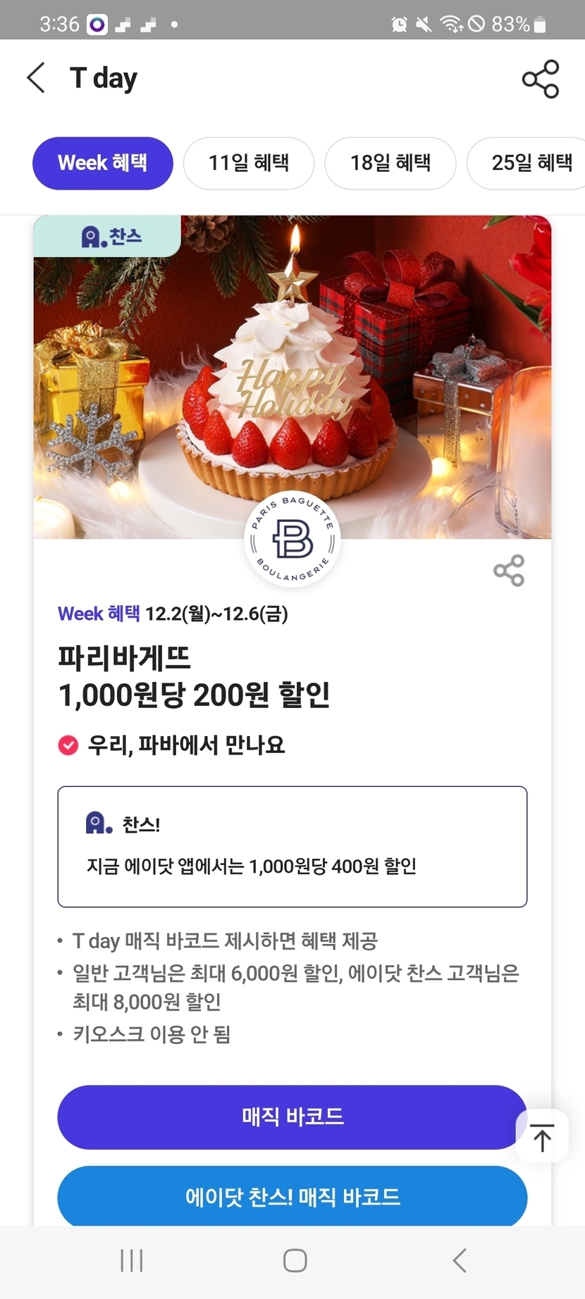 24.12.05 89 읽음 ❤️❤️파리바게트 40%할인❤️❤️ 유리지갑 구독하기 7 8 콘텐츠의 수익 3 내일까지 T멤버쉽에서 에이닷 쿠폰으로 40%할인해서 2만원까지 구매가능하답니다~ 8 0 / 300 입력