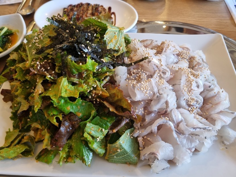 새콤한채소무침과막회가입맛돋군식사.물회로입가심~