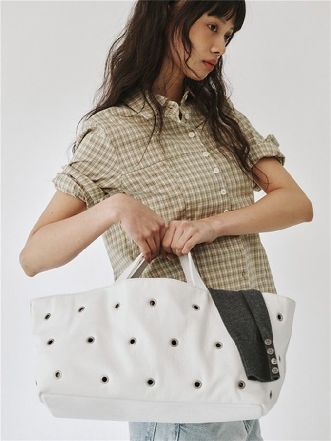 해당 제품은 화이트 컬러의 쇼퍼백으로, 전면에 배치된 아일렛 디테일이 독특한 포인트를 확인할 수 있다. 이 디자인은 심플하면서도 개성 있는 스타일을 연출할 수 있게 해준다.