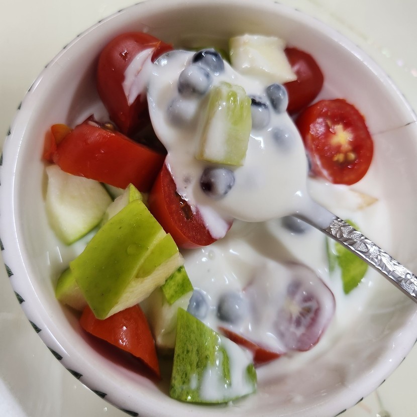 과일 듬뿍넣은 그릭요거트와 옛날사라다로 지인과 저녁합니다