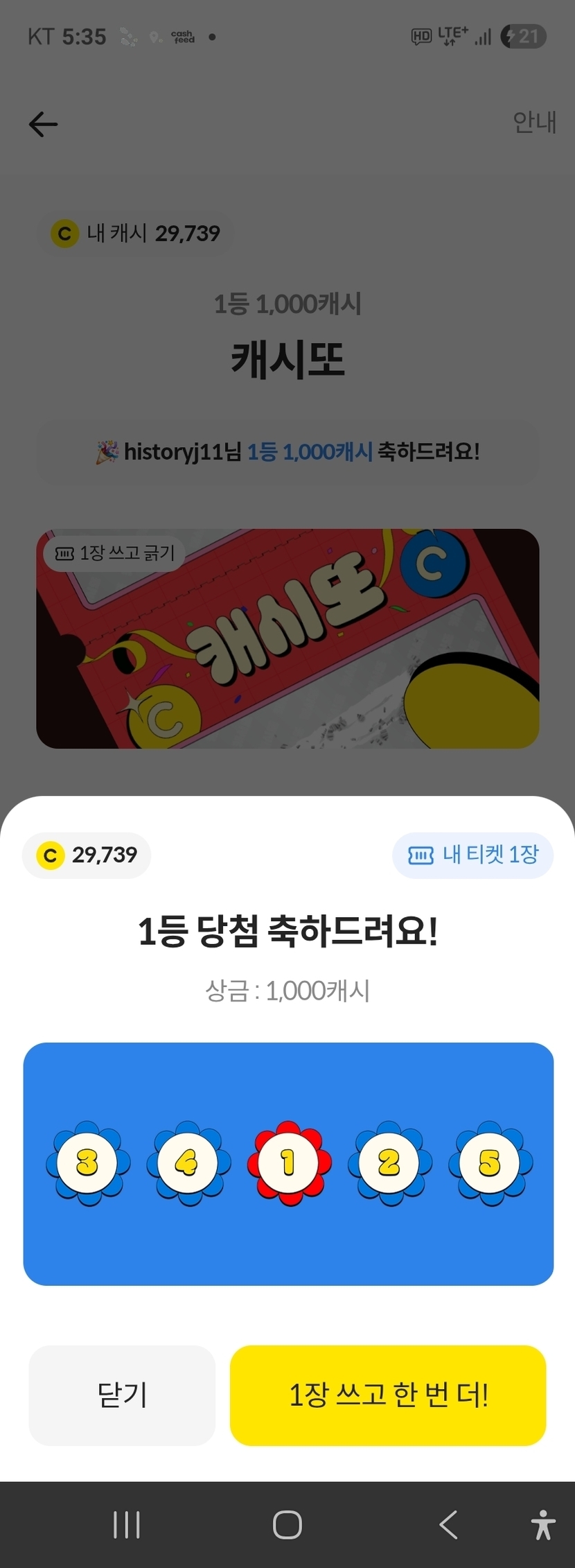 캐시또 1등 당첨 좋아요