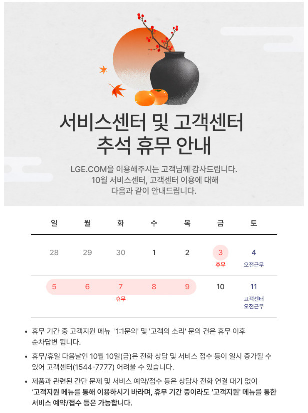 다만 고객센터와 서비스센터는 연휴 기간 중 토요일인 4일과 11일 오전에만 운영한다. 10일은 오전, 오후 모두 수리 서비스를 제공한다.