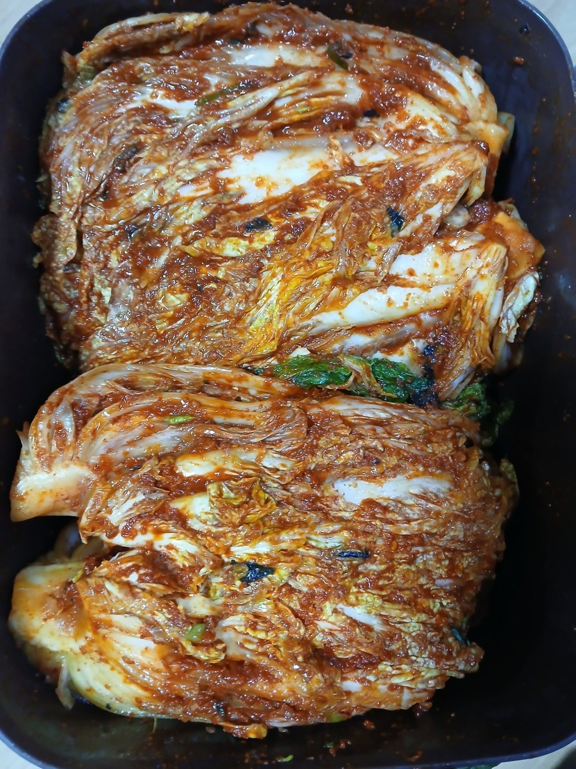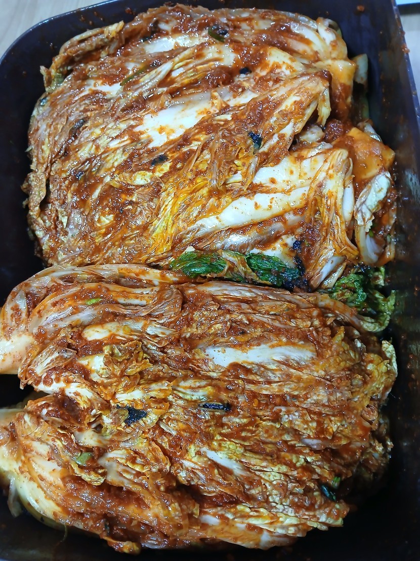 아침 일찍 갔다 내가 가져 온 통에 김치만 치대고