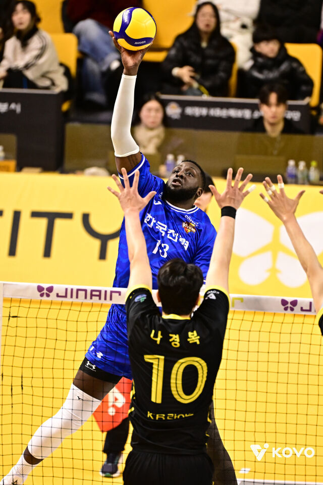 베논은 3일 오후 경민대학교 기념관에서 열린 진에어 2025~2026 V-리그 4라운드 KB손해보험 원정 경기에서 선발로 출전해 27점을 선사했다. 서브 3개, 블로킹 1개도 성공시켰다. 부상에서 돌아온 김정호도 15점을 올리며 팀의 3-1 역전승을 이끌었다.
