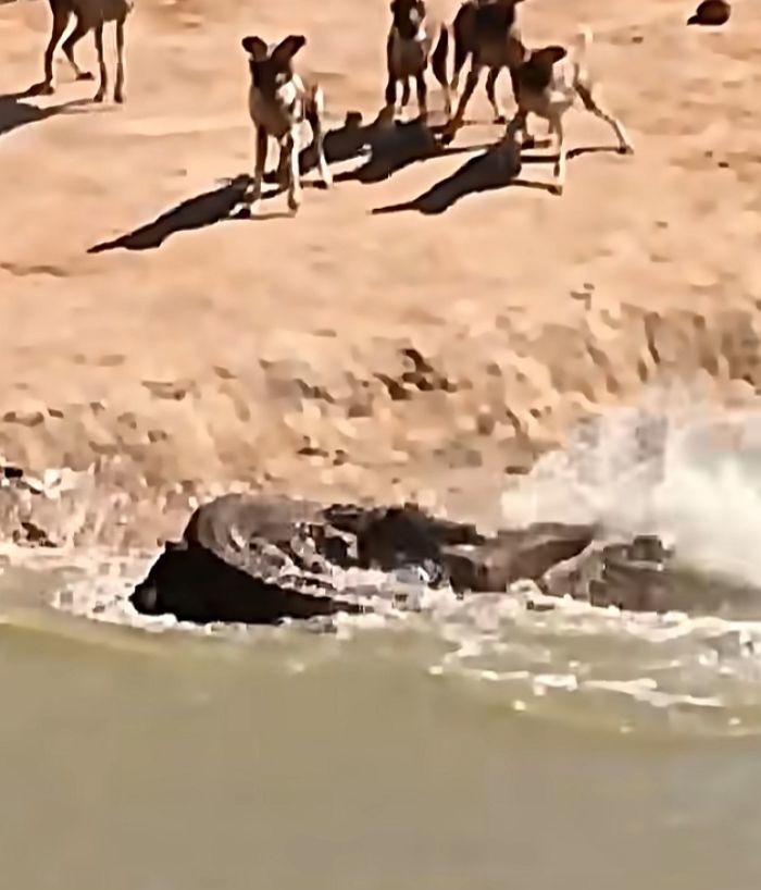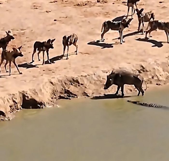 화면을 보시면 강가에서 목을 축이고 있는 멧돼지와 그 뒤를 지켜보는 리카온 무리, 그리고 물속에서 은밀하게 다가오는 악어의 모습이 보이실 겁니다.