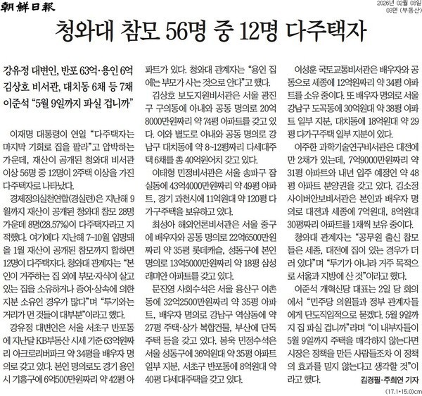 이재명 대통령이 연일 소셜미디어에 부동산 정책 관련 게시물을 올리는 가운데 조선일보가 3일자 3면에 「청와대 참모 56명 중 12명 다주택자」 기사를 냈다. 조선일보는 “재산이 공개된 청와대 비서관 이상 56명 중 12명이 2주택 이상을 가진 다주택자로 나타났다”라고 했다. 청와대 관계자는 기사에서 “본인이 거주하는 집 외에 부모·자식이 살고 있는 집을 소유하거나 증여·상속에 의한 지분 소유인 경우가 많다”며 “투기와는 거리가 먼 것들이 대부분”이라고 했다.