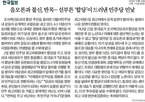 한국일보는 “부동산 안정, 민생경제 회복, 검찰개혁 등 산적한 과제에다 도널드 트럼프 대통령의 관세 인상 위협까지 재개된 상황이다. 이런 시급한 현안을 두고 여당이 합당 갈등으로 소모전을 벌이고 있으니 답답할 노릇”이라며 “당의 자원을 넓혀야 할 합당이 되레 마이너스 효과만 내는 셈이다. 정 대표가 절차를 강행한다면 결과가 어떻게 나오든, 더 큰 후유증을 낳을 수밖에 없다. 지금이라도 중단하고 국정 현안에 집중하는 게 바람직하다”라고 했다.
