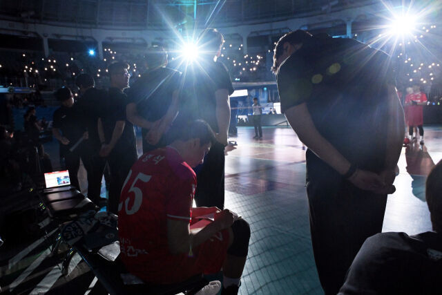 우리카드 선수들을 소개하는 시간은 대략 3~4분 가량 된다. 한국전력 다른 선수들은 코트에서 가볍게 몸을 풀거나 동료 선수들과 이야기를 나눴다. 신영석은 어두운 코트에서 수첩에 연신 메모를 하고 있었다.