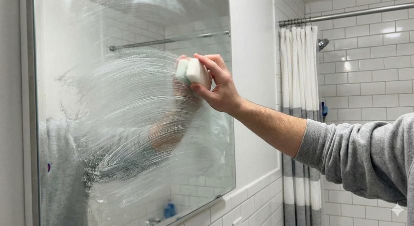 두 번째 단계는 마른 비누를 거울에 직접 문지르는 것이다. 비누에 물을 묻히지 않은 상태로 거울 표면에 슥슥 그려나가듯 바른다. 거울 전체에 하얀 비누 자국이 남을 정도로 꼼꼼하게 문지르는 것이 좋다. 이때 비누 입자가 거울에 고르게 묻어야 나중에 김 서림 방지 효과가 균일하게 나타난다.
