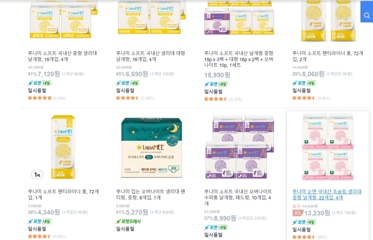 3일 업계에 따르면 쿠팡의 PB 자회사 씨피엘비(CPLB)의 PB 브랜드 ‘루나미’의 생리대 중형(18개입 4팩)과 대형(16개입 4팩) 제품이 모두 품절 상태다.