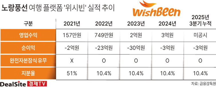 그러나 결과는 기대와 거리가 멀었다. 노랑풍선이 대주주가 된 이후 위시빈은 단 한 차례도 순이익을 내지 못했다. 2021년부터 2024년까지 누적 순손실은 61억원에 달한다. 자본도 빠르게 소진돼, 인수 1년 만에 완전자본잠식 상태에 진입한 뒤 벗어나지 못하고 있다.
