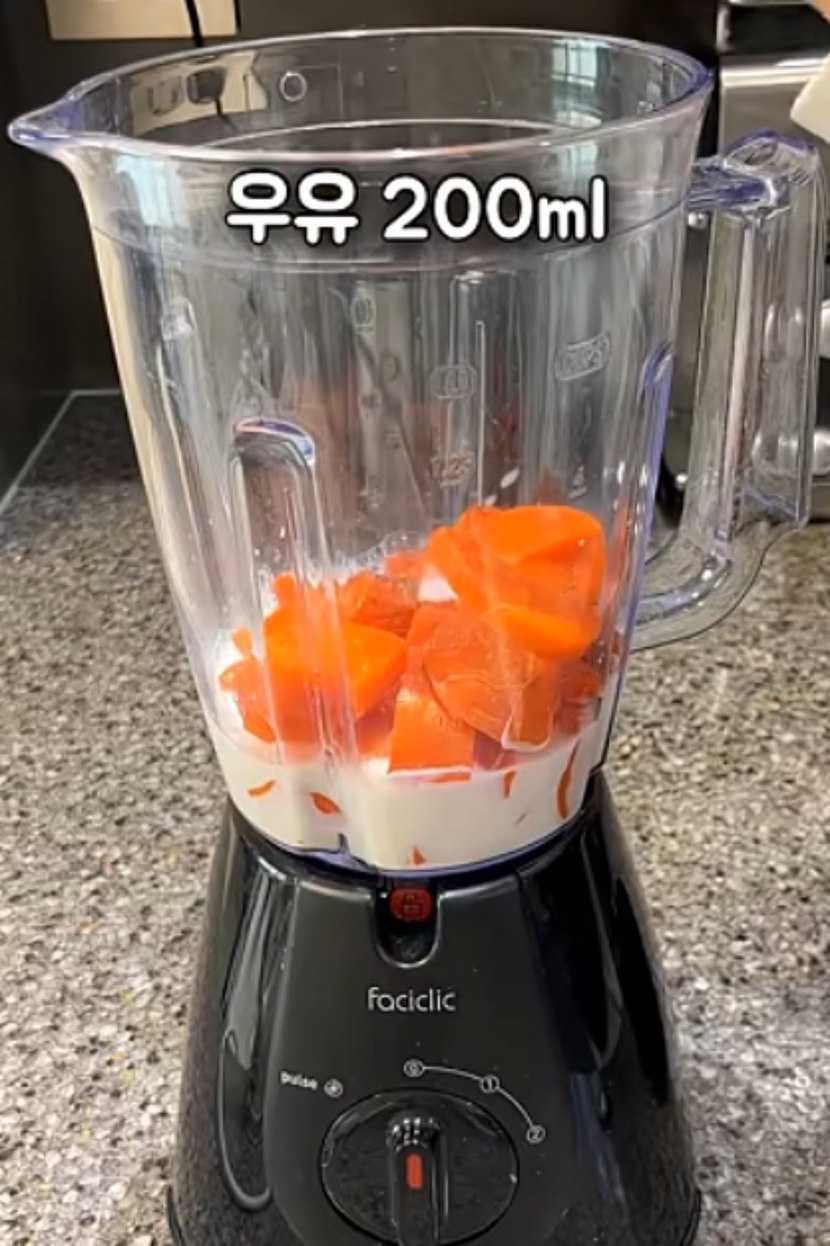 믹서에 당근을 넣은 후 우유 200ml, 소금을 살짝 넣어서 갈아준다. 이후 걸쭉해질 정도로 끓여준 뒤 기호에 따라 알룰로스나 버터를 추가해서 잘 섞어준다. 잘 데워주면 부드러운 당근 수프가 완성된다.