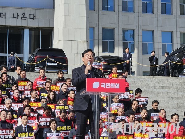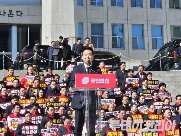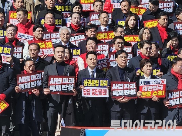 국민의힘은 3일 국회 본관 앞에서 ‘사법독립 헌정수호를 위한 대국민 호소 국민대장정 규탄대회’를 열고 청와대까지 도보투쟁을 진행했다.