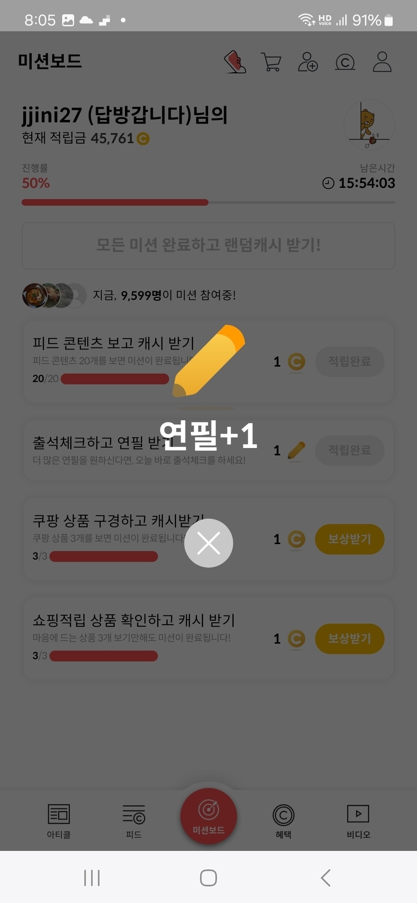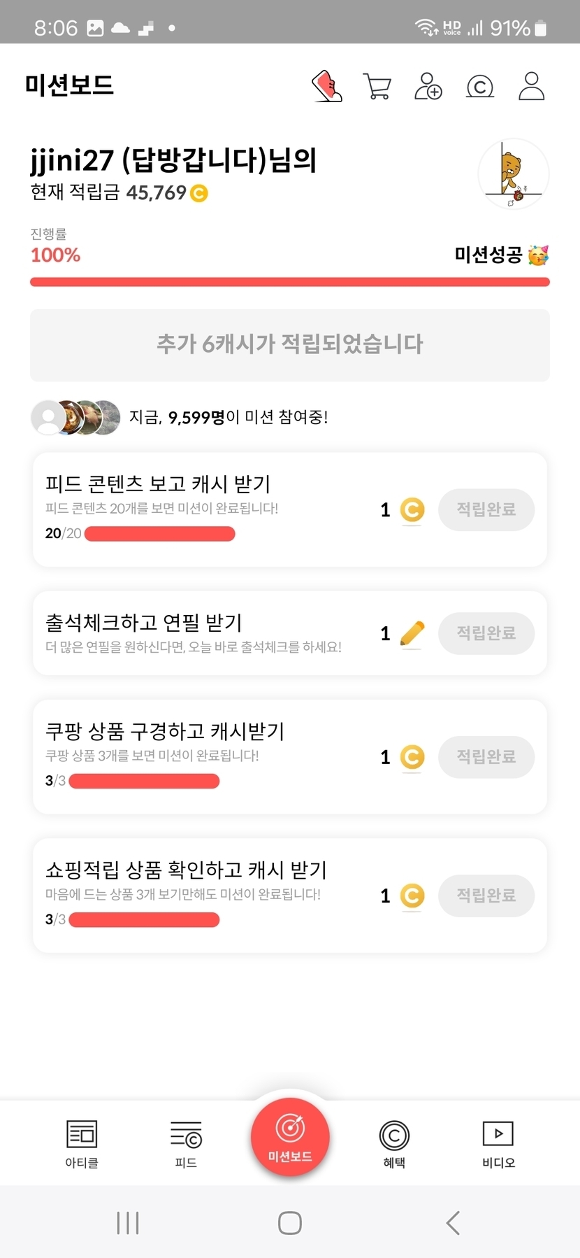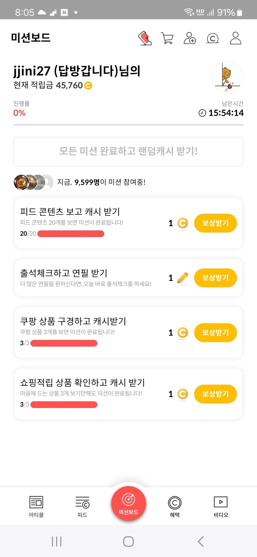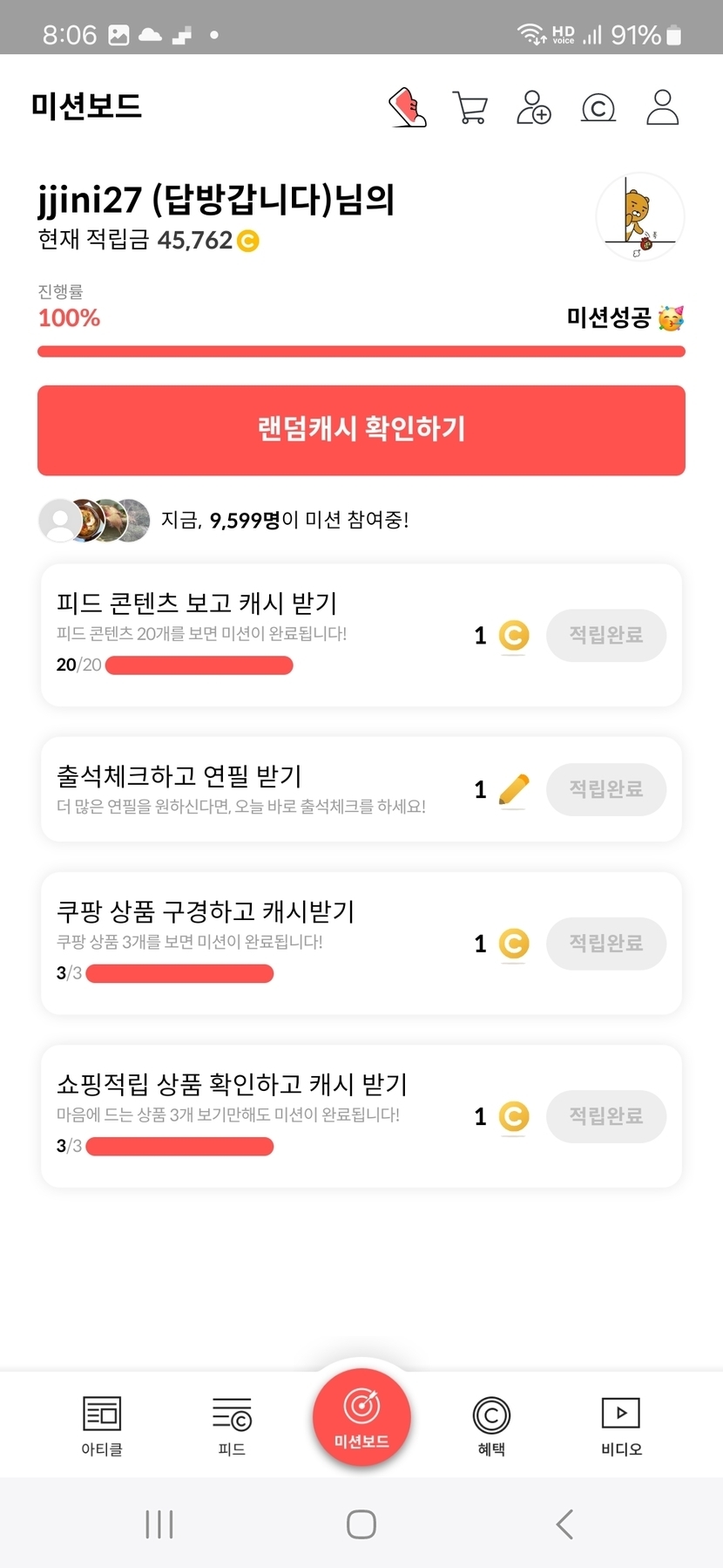 2주 전 200 읽음 3월 8일 오늘의 미션보드 완료 jjini27 (답방갑니다) 구독하기 55 55 콘텐츠의 수익 7 오늘의 미션보드 완료후 6캐시 받았어요 일요일아침 여유롭고 행복한 하루되세요 오늘도 활짝 ^_____________________^. 55 0 / 300 입력