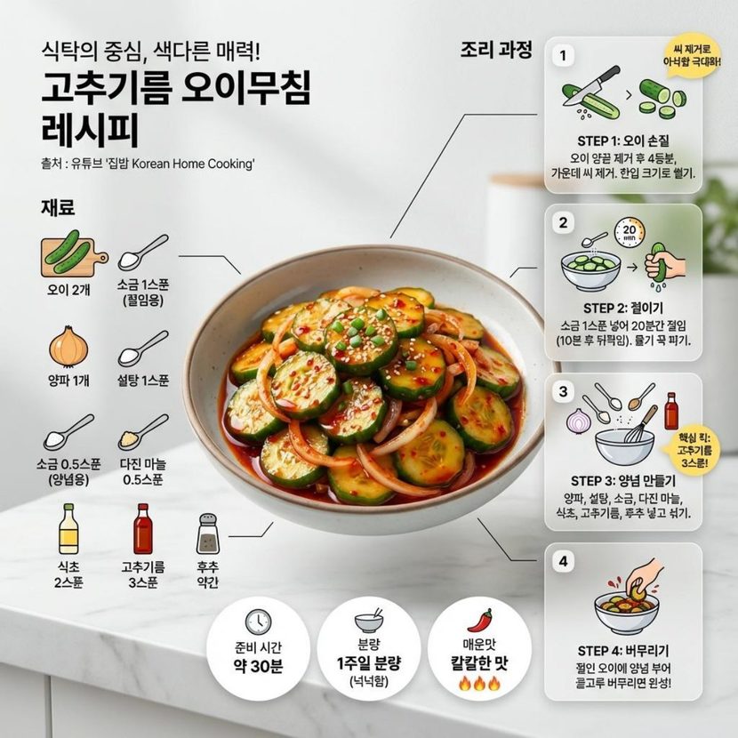 오이는 한국 식탁에서 오랫동안 사랑받아 온 대표적인 채소 가운데 하나다. 특히 오이를 활용한 오이무침은 가정식 반찬은 물론 식당 밑반찬으로도 널리 제공되는 메뉴로 알려져 있다. 간단한 재료와 짧은 조리 시간만으로 만들 수 있다는 점에서 일상적인 반찬으로 꾸준히 소비되고 있다.