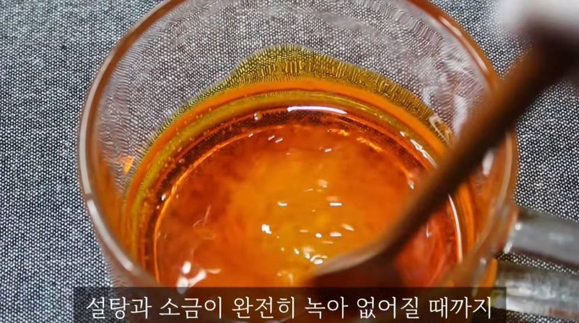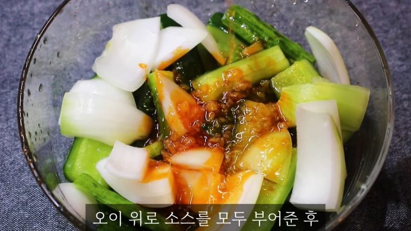 달큰한 매력을 더할 양파 1개를 오이와 비슷한 크기로 썰어 넣은 뒤, 설탕 1스푼, 소금 0.5스푼, 다진 마늘 0.5스푼, 식초 2스푼을 차례로 배합한다. 이 요리의 핵심 킥은 단연 고추기름 3스푼이다.
