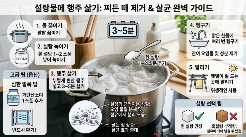 누런 행주 설탕물에 3분 삶아 찌든 때 제거와 살균 효과