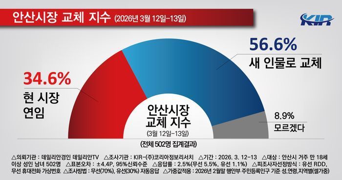 ※ 본 조사는 데일리안경인 데일리안티브이 의뢰로 코리아정보리서치에서 3월 12일, 13일 이틀간 경기 안산시 거주 만 18세 이상 남녀 502명을 대상으로, 무선전화 가상번호(70%)와 유선전화 RDD(30%)를 이용하여 자동응답 방식으로 진행됐다. 응답률은 전체 2.5%이며, 무선전화 5.5%, 유선전화 1.1%이고, 표본오차는 95%의 신뢰수준에 ±4.4%p다. 통계보정은 2026년 2월 말 행정안전부 발표 주민등록 인구 기준 성, 연령, 지역별 셀가중값을 부여했다. 보다 자세한 내용은 중앙선거여론조사심의위원회 홈페이지를 참고하면 된다.