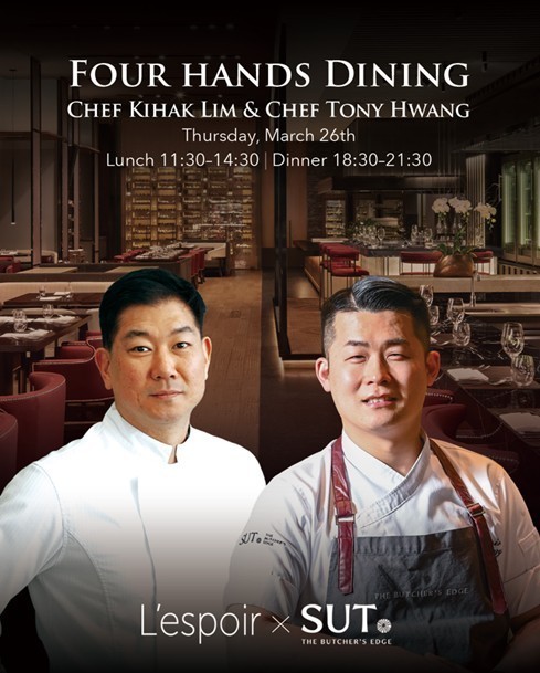 이번 포핸즈 다이닝은 콘래드 서울의 숯불 다이닝 레스토랑 SUT (숯) 더 붓처스 엣지에서 진행되며, 서로 다른 방식으로 재료의 본질적인 풍미를 탐구해온 두 셰프의 만남으로 기획됐다.