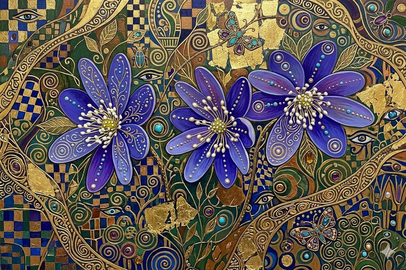 상징적인 배경 요소: 배경을 자세히 살펴보면 클림트가 즐겨 썼던 '눈(eye)' 모양의 장식과 격자무늬, 소용돌이 문양을 발견할 수 있습니다. 또한, 보석 같은 날개를 가진 나비와 곤충들이 숨어 있어 화면에 신비로움과 생동감을 더합니다.