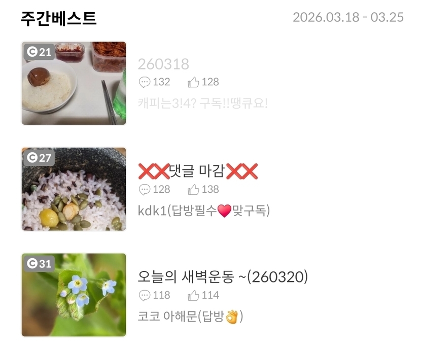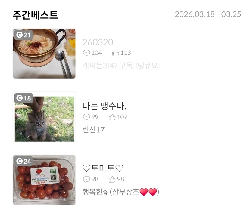 1주 전 514 읽음 260325 캐피는3!4? 구독!!땡큐요! 구독하기 122 120 콘텐츠의 수익 18 부대찌개네이버보니17900원가니 12900원3천원할인주간베스트 감사합니다 숫자놀이오늘도 웃는 좋은하루되세요 120 0 / 300 입력