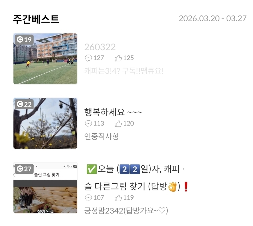 1주 전 1,098 읽음 260327 캐피는3!4? 구독!!땡큐요! 구독하기 132 136 콘텐츠의 수익 21 부대찌개남은거에사리 넣고 냠냠맛나당ㅎ주간베스트 감사합니다 숫자놀이 야호미션하기힘드네요 며칠피드 버벅거리고미션도 잘안되고일하라피드놈들아오늘도 웃는 좋은하루되세요 에혀 136 0 / 300 입력