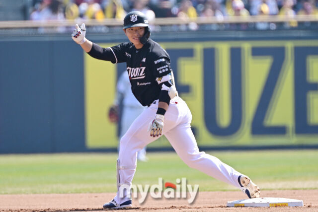 KT 이강민이 7회초 선두 타자로 나와 안타를 친 후 기뻐하고 있다. 개막전 3안타를 기록한 이강민./잠실=한혁승 기자