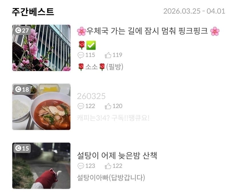 3일 전 664 읽음 260401 캐피는3!4? 구독!!땡큐요! 구독하기 136 140 콘텐츠의 수익 21 어제남은 치킨두부두부냠냠 주간베스트감사합니다 야호야호숫자놀이오늘도 웃는 좋은하루되세요 140 0 / 300 입력