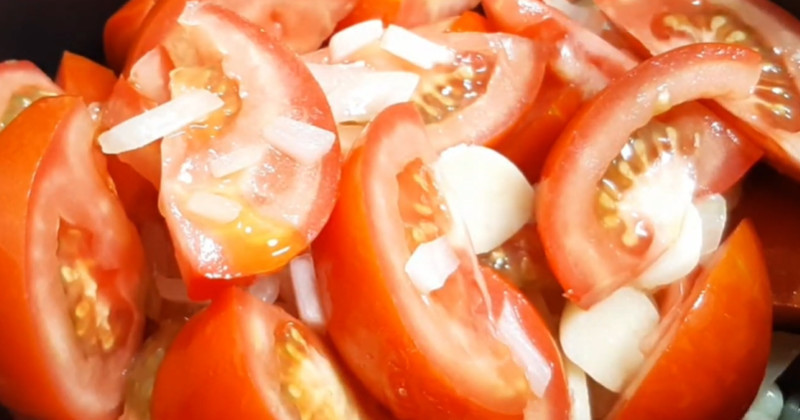 이후 준비한 토마토를 넣고 중불에서 끓인다. 토마토에서 수분이 나오기 때문에 별도의 물은 처음부터 많이 넣지 않아도 된다. 재료가 어느 정도 익으면 물이나 육수를 1~2컵 정도 추가해 농도를 조절한다. 끓이는 동안 소금과 후추로 간을 맞추고, 약 15~20분 정도 더 끓여준다.