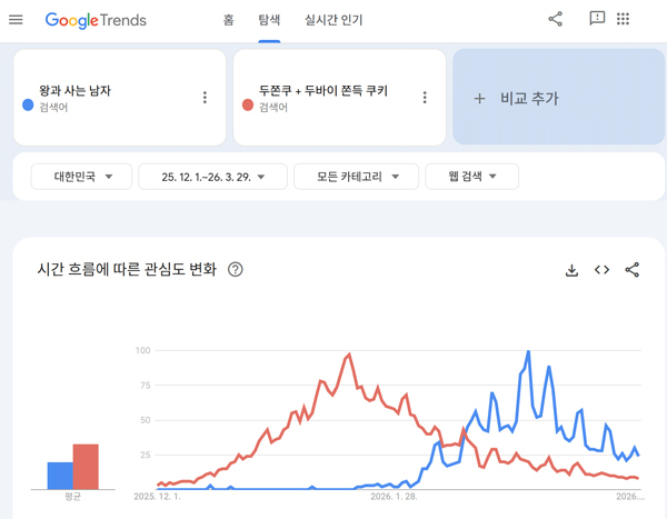 두쫀쿠의 가격은 차이가 있지만 인기있을 때는 7500원 정도였고, 2025년 한국영화의 평균 관람요금은 9600원이므로 가격도 크게 차이나지 않는다. 부담스럽다면 부담스러울 수 있는 가격이지만 유행, 호기심, 함께 대화하기 위한 재료로서 시도해 볼 만한 가격이기도 하다. 이러한 공통점이 반영된 것인지 두쫀쿠와 ‘왕과 사는 남자’의 검색어 인기 변화, 구글 트렌드 동향도 비교적 유사한 형태의 움직임을 보여준다.