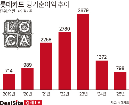 사업보고서 등에 따르면, 롯데카드의 2025년 연결 당기순이익은 전년 대비 41.8% 감소한 798억원을 기록했다.