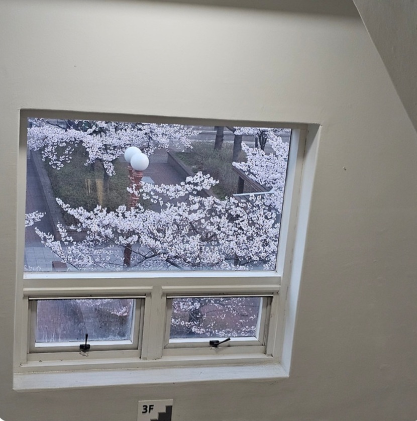 운동 끝나고서 커피숍에서 내려오는 계단에서 창밖 벚꽃