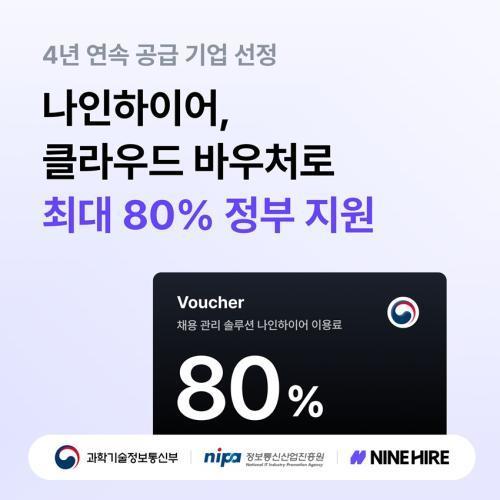 나인하이어는 채용의 모든 과정을 단일 플랫폼에서 자동화·통합 관리할 수 있는 서비스다. 클라우드 바우처로 나인하이어 도입하는 업체는 전체 비용의 80%를 지원받고, 기업용 '엔터프라이즈' 서비스를 이용할 수 있다.