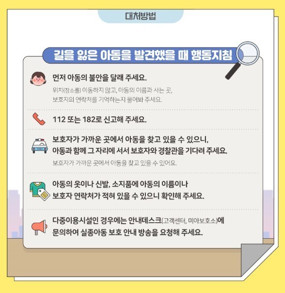 즉시 경찰청(112)이나 실종아동 전문 상담센터(182)에 알린다.