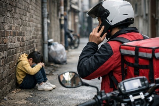 저녁 6시 45분경, 보호자 없이 홀로 겁에 질려 울음을 터뜨리던 7세 아이를 발견한 배달원은 즉시 오토바이를 세웠다. 아이에게 다가가 왜 우는지 묻자 돌아온 대답은 "집을 못 찾겠어요"였다.